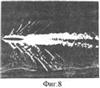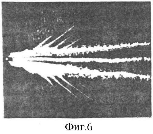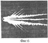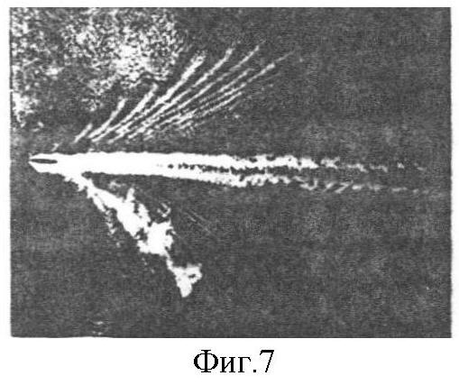 На фиг.6 представлен след от катера. Вследствие очень большой скорости и неглубокого расположения винтов ПТ и ОТ имеют плоский характер в пространстве (горизонтальные размеры значительно превышают вертикальные). Эта структура занимает другое крайнее положение в диапазоне поверхностных полей. Среднее положение принадлежит фиг.3. Катер находится в режиме, близком к глиссирующему. Катер имеет резкую килеватость в носу, большой развал носовых шпангоутов, уменьшающуюся килеватость, постепенно переходящую в плоское днище, острые скулы и транцевую корму (5). Это определяет геометрию КС. Из-за больших центробежных сил ПТ обеднено пузырьками. ОТ получает большое количество пузырьков из ЗК. Большая скорость катера обуславливает высокие и быстрые РЗ и захват ими из ЗК и ОТ большого количества пузырьков.