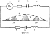 Особым случаем является резонансный, при котором значительно возрастает амплитуда вынужденных колебаний в системе (частота внешнего воздействия совпадает с частотой собственных колебаний системы). Последние лежат в инфранизкочастотном диапазоне. В этом же диапазоне находится частота модуляции 9 несущей частоты колебаний 10 от вращения лопастей винта, т.е. частота циркуляции водоворота. На фиг.16 изображен электротехнический аналог рассмотренной ГД системы (фиг.13) и последовательно упрощенной (фиг.14 и 15). В аналоге под частотой модуляции 8 подразумевается воздействие на фиксированный объем среды (его массу) проходящего движителя и под частотой 10 (упрощенно – черточка, реально – подобие полусинусоиды) – воздействие лопастей. При равенстве указанных частот происходит наибольшая компенсация индуктивного сопротивлениям емкостным и снижение общего сопротивления до минимума. Следствием резонанса является значительные изменения величины и направления вектора упора винта, появление на валу изгибающего момента и килевой качки (на циркуляции и бортовой качки).