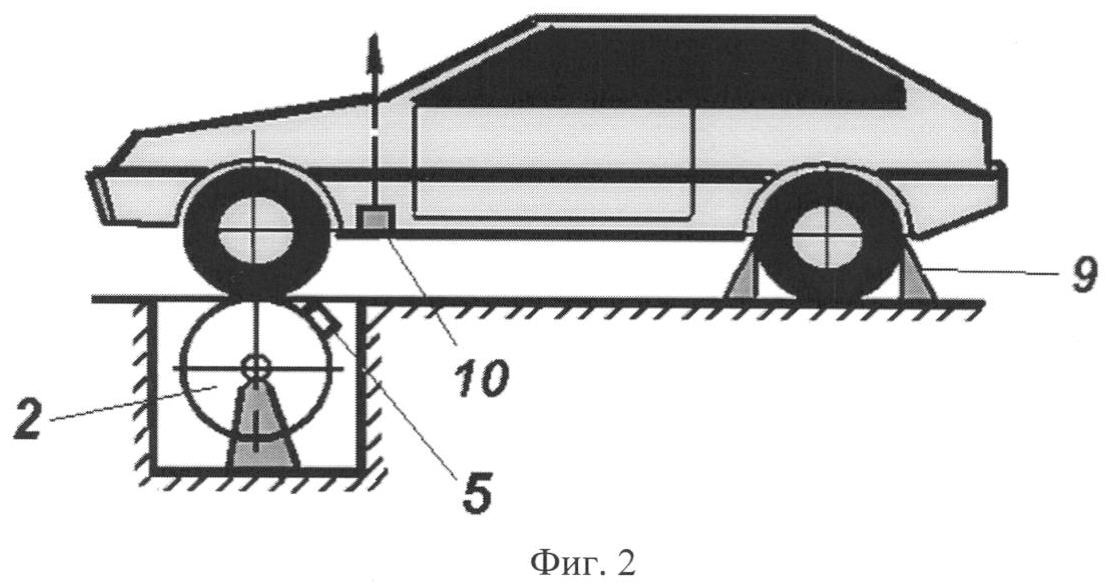 После установки передней оси транспортного средства на беговые барабаны 2 и 3, его закрепления с помощью упоров 9 запускается двигатель автомобиля, ведущие колеса передают вращающий момент опорно-беговым барабанам. При вращении барабана упор 5 в виде планки набегает на колесо, в результате передняя ось автомобиля нагружается вертикальными колебаниями. Комплексное измерительное устройство 10 фиксирует амплитуду перемещения кузова, диапазоны частот колебания, величину ускорений. Данные от датчика частоты вращения 11 и устройства 10 поступают в электронное регистрирующее устройство 12.