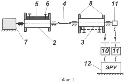 Стенд для испытания ведущих осей автомобиля состоит из основания 1, на которое крепятся опорно-беговые барабаны 2 и 3, вращающиеся на подшипниках. Беговые барабаны приводятся в действие от ведущих колес исследуемой оси переднеприводного автомобиля, каждое из которых установлено на соответствующем опорно-беговом барабане. Они жестко связаны между собой с помощью кардана 4. На одном из барабанов, например, 2 закреплен съемный упор 5, который крепится к барабану с помощью болтов 6. Для более полной имитации дорожных условий и облегчения установки автомобиля стенд снабжен нагружателем 7, который создает дополнительное сопротивление в месте контакта колеса и бегового барабана. Нагружатель непосредственно связан с одним из барабанов. Во избежание падения автомобиля со стенда при испытаниях беговые барабаны снабжены отбойниками 8. Задние колеса автомобиля фиксируются с помощью упоров 9. Также стенд содержит комплексное измерительное устройство 10, датчик частоты вращения 11, электронное регистрирующее устройство 12.