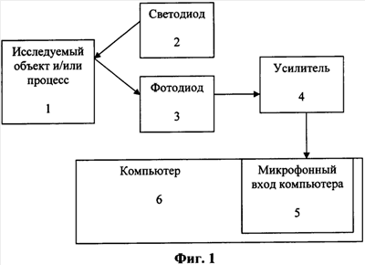 На фиг.1 показана блок-схема реализации способа для регистрации частот звукового диапазона, где 1 – исследуемый объект и/или процесс, 2 – светодиод, 3 – фотодиод, 4 – усилитель, 5 – микрофонный вход компьютера, 6 – компьютер.