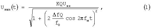 После прохождения частотно-модулированного (ЧМ) сигнала через резонатор 2 этот сигнал оказывается дополнительно промодулирован по амплитуде в соответствии с известным выражением, которое описывает амплитуду Uвых напряжения на выходе резонатора 2 при подаче на его вход ЧМ сигнала с амплитудой Uвх, частотой модуляции fм и девиацией частоты f (3epнов H.B., Карпов В.Г. Теория радиотехнических цепей. М.-Л.: Энергии, 1965, с.620)