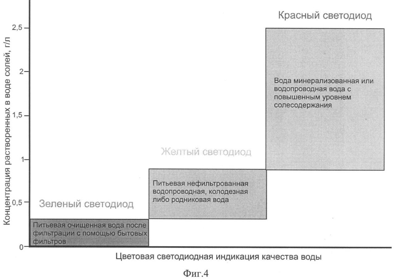 Таким образом, предлагаемое устройство позволяет расширить динамический диапазон измерений с уменьшением степени нелинейности характеристики устройства, повысить стабильность измерения, а цветовая светодиодная индикация наглядно отображает соответствующее качество воды.