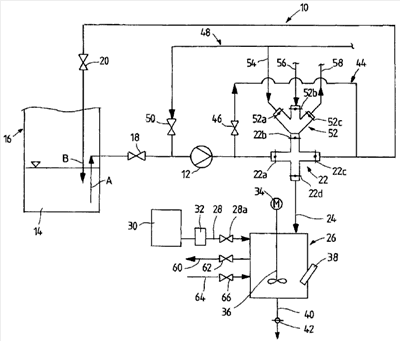 Кроме того, для чистки указанного замкнутого кольцевого трубопровода 10 предусмотрена труба 48 для промывочной воды с запорным клапаном 50. Если указанный клапан 50 открыт, промывочная вода может поступать в указанный замкнутый кольцевой трубопровод 10 в направлении насоса 12.