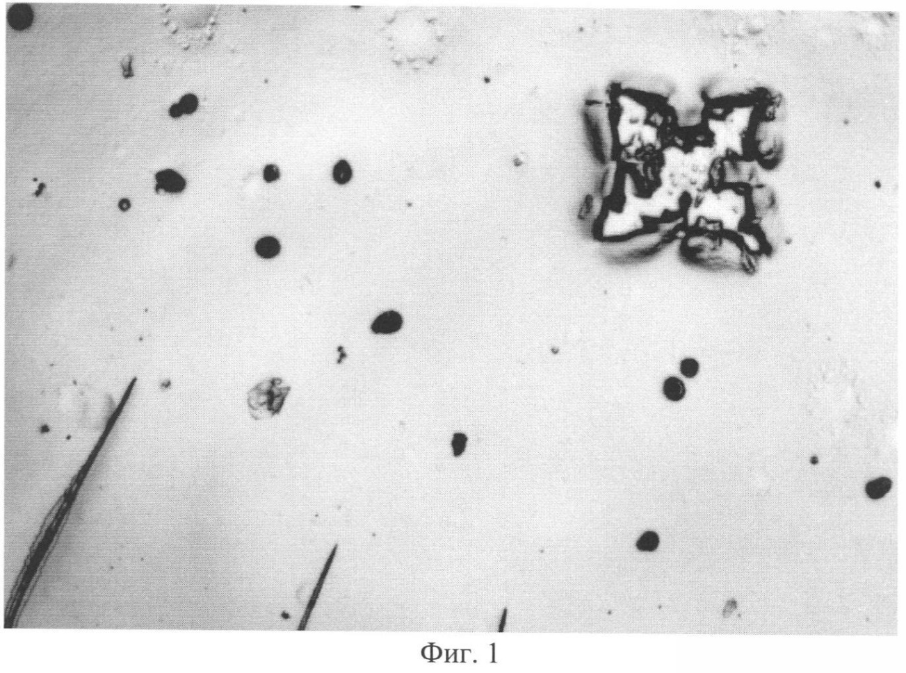 На фиг.5 показано изображение центральной зоны высохшей капли сыворотки крови трупа гр-на П., умершего от алкогольной болезни с поражением сердца, печени, поджелудочной железы. В моче обнаружен анальгин и этиловый спирт (ув. × 50).