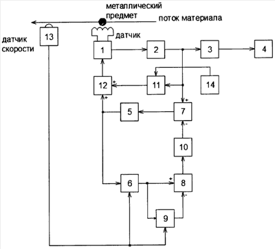 Устройство для обнаружения металлических предметов в потоке материала, содержащее последовательно соединенные датчик, включающий высокочастотный генератор, детектор, формирователь импульсов, исполнительный механизм, а также интегратор, связанный входом управления с задатчиком напряжения, и элемент задержки, связанный входом управления с датчиком скорости перемещения контролируемого материала, отличающееся тем, что оно дополнительно содержит усилитель, второй интегратор, преобразователь импульсов и три сумматора, причем первый сумматор своим неинвертирующим входом соединен с выходом детектора, вход усилителя соединен с выходом первого сумматора, информационный вход второго интегратора соединен с выходом усилителя, а вход управления второго интегратора связан с датчиком скорости перемещения контролируемого материала, информационный вход звена задержки соединен с выходом второго интегратора, второй сумматор своим неинвертирующим входом соединен с выходом второго интегратора, а инвертирующим входом с выходом звена задержки, выход второго сумматора соединен со входом преобразователя импульсов, а выход преобразователя импульсов соединен с инвертирующим входом первого сумматора, третий сумматор своим первым неинвертирующим входом соединен с выходом усилителя, а вторым неинвертирующим входом с выходом первого интегратора, информационный вход первого интегратора соединен с выходом детектора, а выход третьего сумматора соединен со входом управления высокочастотного генератора.