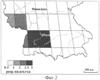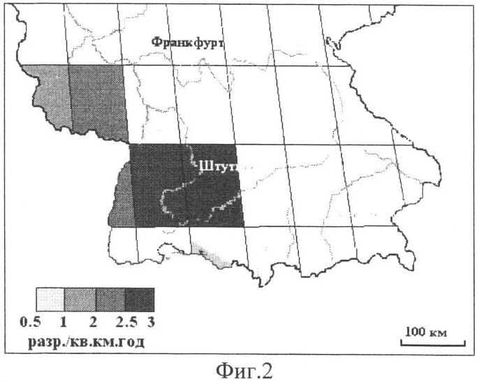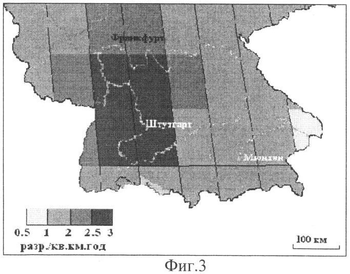 Значение N оценочное составило для искомых трапеций 1-3 разряда на 1 км в год. Анализ распределения плотности разрядов на землю, полученных по предложенному способу (фиг.2) и с помощью наземных пунктов сети наблюдений (фиг.3), показал, что коэффициент корреляции между значениями, зарегистрированными с помощью наземной сети (представлено на фиг.3) и полученными в результате расчета, высок и статистически значим с вероятностью не менее 95%.