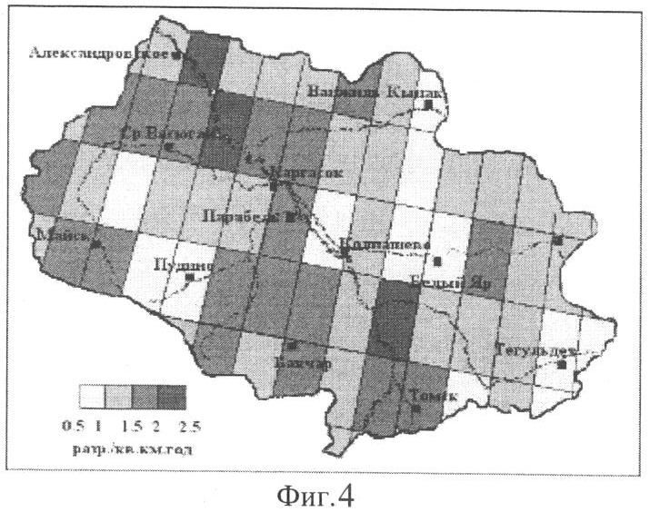 Полученное соотношение для этой равнинной территории Германии применили для территории Томской области. Для Томской области данные о количестве разрядов молний, зарегистрированных из космоса для всех трапеций с шагом в 1°, пересчитали в значения плотности разрядов молний на 1 км2 за год и полученные значения подставляли в уравнение (2). В результате была получена плотность разрядов молнии в землю для всех трапеций с шагом в 1° и построена карта-схема плотности разрядов молнии в землю для всей территории Томской области (фиг.4).