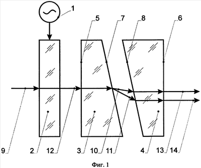 Для функционирования устройства по варианту 2 важно, чтобы зазор между клиньями был заполнен материалом с показателем преломления, величина которого находится между высшей и низшей величинами показателя преломления для «необыкновенного» пучка клиньев.