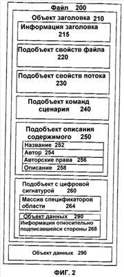 Можно предотвратить фальсификацию частей объекта 210 заголовка за счет добавления подобъекта 260 с цифровой сигнатурой. Подобъект 260 с цифровой сигнатурой содержит массив 264 спецификатора области и сигнатуру 266. В соответствии с одним из вариантов подобъект 260 с цифровой сигнатурой также содержит информацию 268 о подписавшейся стороне. В соответствии с одним из вариантов информация 268 о подписавшейся стороне содержит один или несколько сертификатов, которые могут быть использованы для надежной проверки сигнатуры 266.