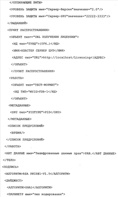 В одном варианте изобретения можно использовать простой протокол доступа к объекту (ППДО) для связи между приложением 302 защиты содержания или представляющим приложением и сервером 320 ЦУП. Кроме того, могут быть предусмотрены библиотеки ИПП, такие как ИПП 306, так что приложения, такие как приложение 302, не будут должны реализовывать клиентскую сторону протокола ЦУП, а будут только делать вызовы локального ИПП. Предпочтительно, для описания прав, лицензий и меток прав для цифрового содержания используется язык XrML, XML, хотя понятно, что можно использовать любой пригодный формат для описания прав и других данных.