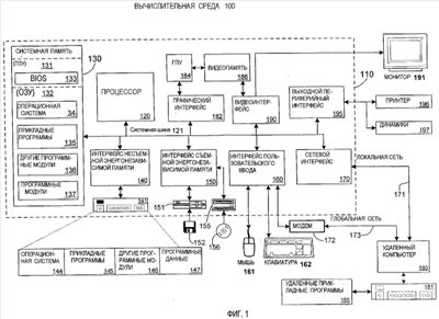 При использовании в сетевой среде ЛВС компьютер 110 подключен к ЛВС 171 через сетевой интерфейс или адаптер 170. При использовании в сетевой среде ГВС компьютер 110 обычно содержит модем 172 или другие средства для установления связи через ГВС 173, такой как Интернет. Модем 172, который может быть внешним или внутренним, может быть подсоединен к системной шине 121 через интерфейс 160 пользовательского ввода или другой соответствующий механизм. В сетевой среде программные модули, показанные в связи с компьютером 110, или их части могут храниться в удаленном запоминающем устройстве. Например, что не является ограничением, на фиг.1 показаны удаленные прикладные программы 185, находящиеся в запоминающем устройстве 181. Понятно, что показанные сетевые соединения являются примерными и можно использовать другие средства для установления каналов связи между компьютерами.