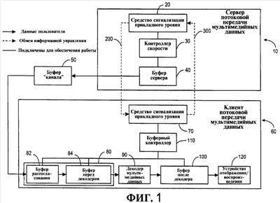 Потоковый сервер 10 содержит средство 20 сигнализации прикладного уровня, контроллер 30 скорости и буфер 40 сервера. Потоковый клиент 60 содержит средство 70 сигнализации прикладного уровня, соответствующее средству 20 сигнализации прикладного уровня в потоковом сервере 10 и адаптированное для осуществления связи с ним. Он дополнительно содержит буфер 80 клиента, который в варианте осуществления изобретения, показанном на фиг. 1, содержит буфер 82 рассогласования и буфер 84 перед декодером, интегрированные в один модуль. В других вариантах осуществления изобретения потоковый клиент 60 может включать в себя буфер рассогласования и буфер перед декодером, которые реализованы по отдельности. Потоковый клиент дополнительно содержит декодер 90 мультимедийных данных, буфер 100 после декодера, буферный контроллер 110 и устройство 120 воспроизведения/отображения.