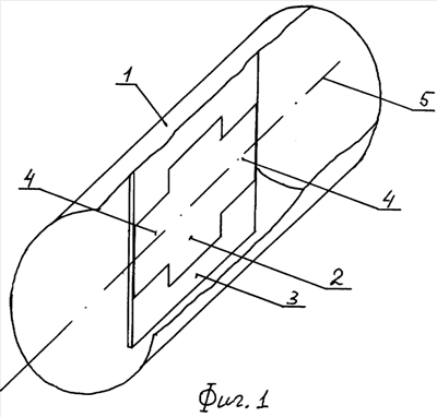 Для реализации предлагаемого поляризатора требуются большие величины коэффициента замедления волны, что достигается применением продольного плоского широкого проводника 2. Благодаря этому поляризатор получается коротким. Например, в С-диапазоне длина поляризатора с одноступенчатыми трансформаторами на концах составляет около 60 мм. Поляризатор на основе диэлектрической фторопластовой пластины вдвое длиннее.