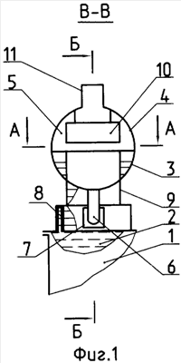 Предлагаемое устройство для защиты трансформатора от разрыва бака и пожара представлено на фиг.1-4, где на фиг.1 – общий вид устройства и сечение по В-В; на фиг.2 – вид сбоку и сечение по Б-Б; на фиг.3 – вид сверху, сечение по А-А; на фиг.4 – другой вариант исполнения устройства.