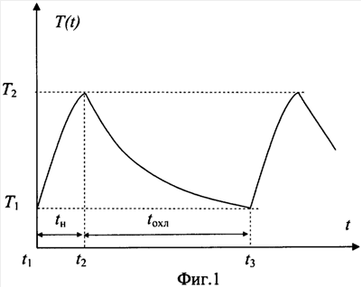 Наиболее распространенным является вариант режима работы лазера с непрерывным охлаждением и импульсными накачкой и генерацией. Динамика квазистационарного режима изменений температуры активного элемента при генерации лазерного излучения может быть представлена в виде графика на фиг.1 (см., например, Справочник по лазерной технике. /Под редакцией Байбородина Ю.В., Криксунова Л.З., Литвиненко О.Н. – Киев: Технiка, 1978, стр.74).