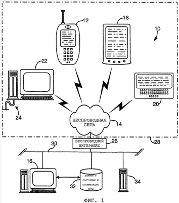 Ссылаясь на чертежи, на которых подобные номера позиций повсюду представляют подобные элементы, Фиг. 1 иллюстрирует беспроводную сеть 10, имеющую множество компьютерных устройств 12, 18, 20 и 22 в области беспроводной сети 28. Беспроводная сеть 14 связана через интерфейс 26 с сетью 28, базирующейся на локальной сети (LAN), предпочтительно с помощью, по меньшей мере, одного сервера 16 сбора данных о состоянии сети и управления, причем сервер 16 выборочно загружает программные приложения или агенты в беспроводные устройства 12, 18, 20, 22 через беспроводной интерфейс 26 так, что беспроводное устройство может поставлять данные о состоянии сети назад, серверу 16, как описано далее. Такие компьютерные устройства могут включать в себя беспроводные устройства, такие как сотовые телефоны 12, персональный цифровой помощник 18 (PDA), пейджер 20, который показан здесь как двухсторонний текстовый пейджер, или даже отдельную компьютерную платформу 22, которая имеет беспроводной портал связи, но с другой стороны может иметь и проводное подключение 24 к сети или Интернету. Система и способ соответственно могут быть реализованы на компьютерном модуле компьютерного устройства любой формы, включающего в себя проводной или беспроводной портал связи, включающий в себя (но не в ограничительном смысле), беспроводные модемы, терминалы доступа на картах PCMCIA (Международной ассоциации производителей плат памяти для персональных компьютеров), терминалы доступа персональных компьютеров, телефоны без дисплея или клавиатуры, или любые комбинации или подкомбинации вышеперечисленного.