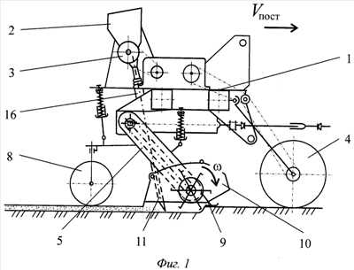 В случае встречи Г-образного ножа с предметом, чья твердость и прочность значительно превосходят соответствующие параметры почвы, демпферные пружины сжимаются до выбора зазоров между витками пружины. Дальнейшее возрастание нагрузки на Г-образный нож в случае, когда фрезерные секции шарнирно установлены на раме с углом наклона оси симметрии фрезерной секции, проходящей через оси вращения подвеса фрезерной секции и рабочего органа, перпендикулярным касательной к траектории движения Г-образного ножа в момент вхождения его в почву, передается непосредственно на пружину, соединяющую фрезерную секцию и раму сеялки. При этом пружина, соединяющую фрезерную секцию и раму сеялки, под действием ударной нагрузки сжимается, и рабочий орган фрезерной секции выглубляется из почвы, что позволяет предохранить Г-образные ножи рабочего органа от поломки. Такая установка фрезерной секции позволяет наиболее полно и своевременно передавать энергию удара Г-образного ножа о препятствие на пружину, соединяющую фрезерную секцию и раму сеялки, что повышает точность и надежность выглубления рабочего органа из почвы. После того как контакт Г-образного ножа с препятствием закончится, рабочий орган под действием пружины, соединяющей фрезерную секцию и раму сеялки, заглубится в почву, и процесс фрезерования почвы возобновится.