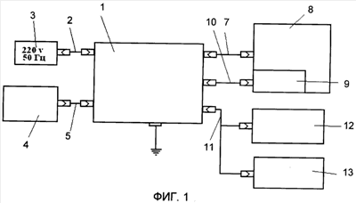 Электрический разъем с кабелем 11 обеспечивает вывод видеосигнала T/V стандарта на видеоконтрольные устройства 12 (для левого глаза) и 13 (для правого глаза). Видеосигнал представляет собой изображение глаз пациента. Видеоконтрольные устройства 12 и 13 подключаются к БУ аккомодометру и могут быть использованы из числа известных устройств типа кино- или фотокамер.