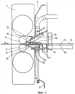 фиг.1 – прокатная клеть с последующим устройством для обдува полосы в вертикальном разрезе в направлении прокатки;