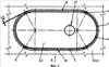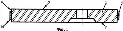 Металлический бандаж 4 размещен на боковой поверхности 6 основания 1 плиты с натягом. Это достигается посадкой бандажа 4 на основание 1 нагоряче или в зависимости от конструкции бандажа 4, который может быть с разъемом или состоять из двух частей (см. фиг.21), которые стягиваются, например, при помощи болтов, заклепок, контактной сварки и т.д. Кроме этого, бандаж 4 может быть размещен на боковой поверхности 6 плиты посредством слоя клеящего вещества, такого, например, как огнеупорный мертель (на фигурах слой клея условно не показан) и т.д. Более совершенной формой размещения бандажа 4 на огнеупорной плите является эластичный огнеупорный материал, который после сборки и технологической термообработки обеспечивает необходимую степень фиксации бандажа 4 на боковой поверхности 6 плиты и сохраняет в дальнейшем некоторую степень податливости для компенсации неточностей изготовления соединяемых деталей или тех же самых температурных расширений.