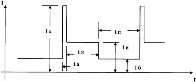 Сущность предлагаемого способа заключается в следующем. Дуговой промежуток питают импульсами постоянного тока, в промежутке между которыми горит дежурная дуга (ток паузы). В конце тока паузы, непосредственно перед рабочим импульсом, накладывают дополнительный активирующий импульс постоянной частоты и длительности, который задается перед началом процесса наплавки. Частота дополнительных импульсов должна быть равной частоте рабочего импульса, а длительность 0.001÷0.0015 сек. Ток рабочего импульса может достигать 70 А, а дополнительный активирующий импульс должен находиться в пределах 250÷300 А. При таких параметрах обеспечивается гарантированный физический контакт наплавленной поверхности с защищаемой поверхностью, исключающий дефект наплавки в виде несплавлений.
