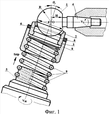 Стакан 8 жестко закреплен на одном конце винтовой цилиндрической пружины 9, которая вторым концом навернута и жестко закреплена на шпинделе 5. Продольная ось устройства проходит через центр О обрабатываемой неполной сферической поверхности 1 и расположена под углом к плоскости, перпендикулярной продольной оси заготовки 4. Угол наклона оси шпинделя и кольца с алмазоабразивной и деформирующей внутренними частями устройства к плоскости, перпендикулярной продольной оси заготовки и проходящей через центр неполной сферической поверхности, определяется по формуле: