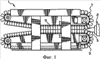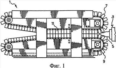 На фиг.1 показано устройство для формовки трубы, обозначенное в целом позицией 1. Это устройство содержит экструдер 3, который подает расплавленную пластмассу через головку 5 в движущийся формовочный туннель, обозначенный в целом позицией 11, в устройстве 1. Формовочный туннель 11 образован секциями 7 и 9 формовочных блоков, которые перемещаются на бесконечных лентах. Эти части формовочных блоков сближаются друг с другом, когда проходят через формовочный туннель 11.