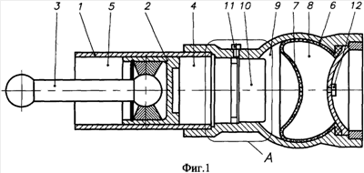 Внутри баллона 6 снаружи корпуса 10 установлено подпружиненное с помощью пружины сжатия 29 кольцо 30, которое при взаимодействии с диафрагмой 7 предотвращает ее выдавливание в зазор между корпусом 10 и баллоном 6 в конце хода отбоя.