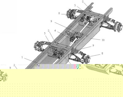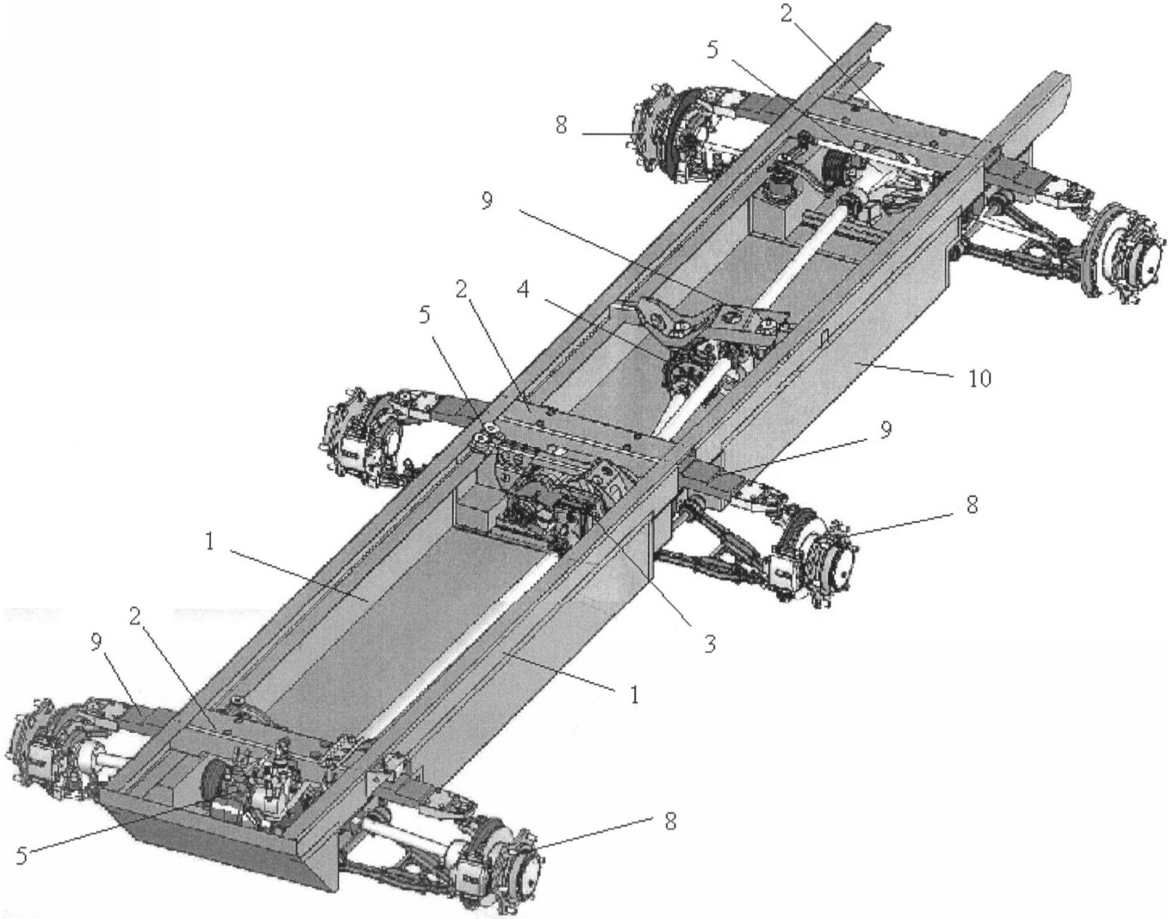 На раме закреплена приводимая от двигателя основная раздаточная коробка 3, дополнительная раздаточная коробка 4 и три ведущих моста 5 одинаковой конструкции и габаритов, предназначенных для привода колес. При этом третий ведущий мост расположен между передним и задним ведущими мостами. Дифференциалы 6 переднего и третьего мостов смещены к одному лонжерону, а дифференциал 7 заднего моста смещен к другому лонжерону. Колесные валы от дифференциалов пропущены через отверстия в вертикальных стенках лонжеронов и через конечные передачи 8 связаны с колесами. К каждой из трех основных поперечин 2 к нижней ее поверхности прикреплен картер соответствующего ведущего моста. Таким образом, все ведущие мосты оказываются закрепленными под поперечинами.