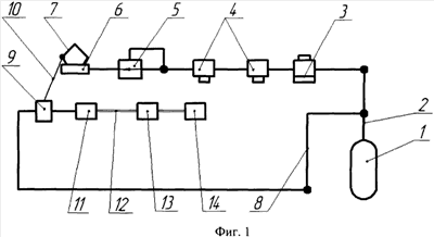 Из резервуара с воздухом 1 воздух под давлением поступает по питательной магистрали 2 через вентиль защиты 3 в пневматические блокировки 4, запирающие ВВК, и далее через вентиль токоприемника 5 в цилиндр токоприемника 6, поднимающий токоприемник 7. Токоприемник 7 может быть поднят только в случае полного закрытия задвижных штор ВВК. Если задвижные шторы и двери ВВК открыты, пневматические блокировки 4 перекрывают проход воздуха к вентилю токоприемника 5, и подъем токоприемника 7 невозможен. Если при опускании токоприемника 7 он по какой-либо причине не опустится, то при включенном ГВ вентиль защиты 3 находится под напряжением и не выпускает воздух из пневматических блокировок 4. Вход в ВВК в этом случае не возможен. Если при опускании токоприемника 7 он по какой-либо причине не опустится и в контактной сети в это время не будет электричества, то вентиль защиты 3 не будет под напряжением и выпустит воздух из пневматических блокировок 4. Вход в ВВК возможен. Чтобы этого не произошло, воздух от резервуара с воздухом 1, проходя по другой питательной магистрали 8 через пневматический клапан 9, взаимодействует через шток с указанным токоприемником 7. Если токоприемник 7 поднят, воздух через пневматический клапан 9 поступает на электрический датчик давления 11, последний через провода 12 обеспечивает замыкание цепи питания катушки электромагнитного контактора 13, приводящее к включению электромагнитного контактора 13, обеспечивающего замыкание цепи питания катушек электрических блокировок, приводящее к тому, что электрические блокировки 14 блокируют ВВК. Вход в ВВК не возможен. Если токоприемник 7 опущен, воздух через пневматический клапан 9 не поступает на электрический датчик давления 11, последний через провода 12 не обеспечивает замыкание цепи питания катушки электромагнитного контактора 13, приводящее к бездействию электромагнитного контактора 13, не замыкающего цепи питания катушек электрических блокировок, из-за чего электрические блокировки 14 не блокируют ВВК. Вход в ВВК возможен.