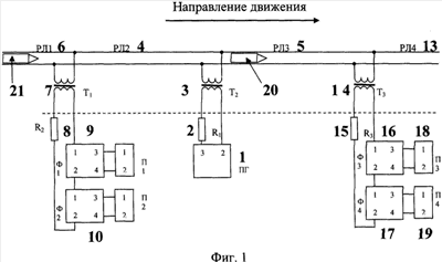 На фиг.1 представлены генератор (ПГ) 1, ограничитель тока питающего конца с учетом сопротивления кабеля (R1) 2, трансформатор питающего конца (T1) 3, предыдущая рельсовая линия (РЛ2) 4, рассматриваемая рельсовая линия (РЛ3) 5, смежная рельсовая линия (РЛ1) 6, трансформатор первого приемного конца (Т2) 7, резистор – эквивалент сопротивления кабеля (R2) 8, фильтры (Ф1) 9 и (Ф2) 10, приемники (П1) 11 и (П2) 12, последующая рельсовая линия (РЛ4) 13, трансформатор второго приемного конца (Т3) 14, резистор – эквивалент сопротивления кабеля (R3) 15, фильтры (Ф3) 16 и (Ф4) 17, приемники (П3) 18 и (П4) 19, первый и второй поезда 20 и 21.