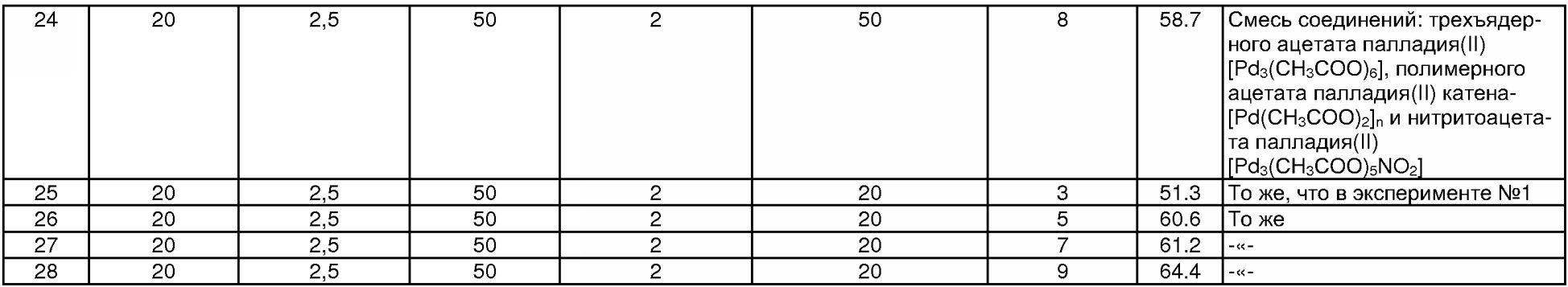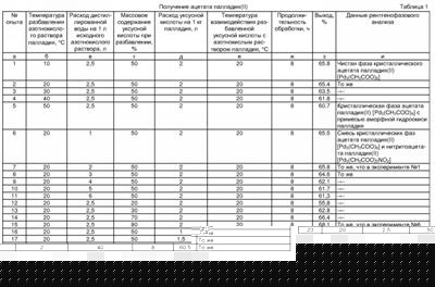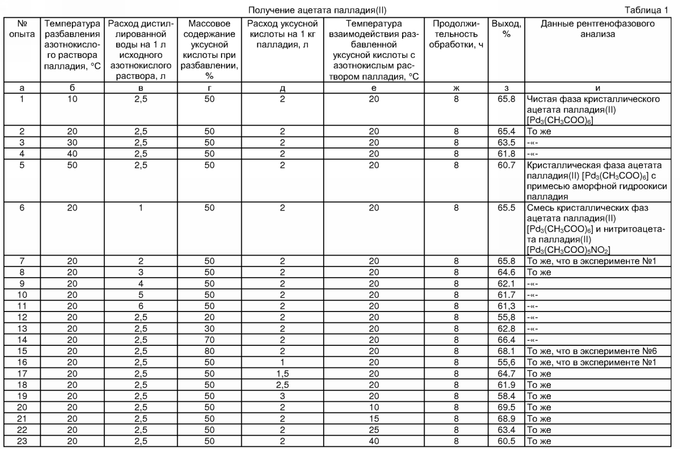 Изобретение относится к области синтеза солей платиновых металлов, в частности солей палладия, а именно ацетата палладия(II), применяемого в качестве катализатора или для получения исходной соли для производства других солей палладия. Способ получения ацетата палладия включает растворение металлического палладия в концентрированной азотной кислоте, фильтрование и упаривание азотнокислого раствора палладия и проведение реакции с уксусной кислотой, где азотнокислый раствор палладия после упаривания, до начала кристаллизации соли нитрата палладия(II), обрабатывают дистиллированной водой в объеме в (2-5) л на 1 кг палладия в исходном азотнокислом растворе, затем разбавленной водой уксусной кислотой (30-70%) с расходом (1,5-2,5) л уксусной кислоты на 1 кг палладия в исходном азотнокислом растворе, и полученный раствор выдерживают не менее 8 ч при температуре (15-40)°С. Технический результат – упрощение способа получения ацетата палладия(II) и его синтез в монофазовом состоянии без примеси нерастворимого полимерного ацетата палладия(II) и нитритоацетатного соединения палладия(II). 1 з.п. ф-лы, 1 табл.