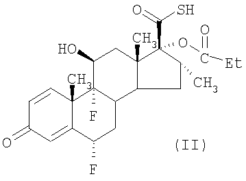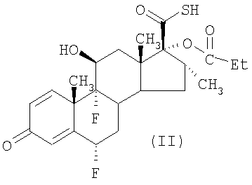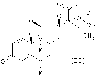 с активированным производным пропионовой кислоты, например пропионилхлоридом. Активированное производное пропионовой кислоты обычно применяют, по меньшей мере в двукратном молярном количестве относительно соединения формулы (III), поскольку один моль реагента взаимодействует с тиокислотной группировкой и требуется, что он был удален, например, взаимодействием с амином, например диэтиламином. Однако этот способ получения соединения формулы (II) обладает недостатками, состоящими в том, что получаемое в результате соединение формулы (II) нелегко очистить от загрязняющего его побочного продукта N,N-диэтилпропанамида. Таким образом, авторы изобрели улучшенный способ осуществления превращения для получения соединения формулы (II). Другие способы получения пропионата флутиказона и родственных соединений описаны в заявке на патент Израиля 109656 (Chemagis), WO 01/62722 (Abbott) и в Kertesz and Marx (1986), J.Org.Chem., 51, 2315-2328). Таким образом, согласно изобретению также предложен способ получения (в дальнейшем “способ (б)”) соединения формулы (II)