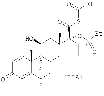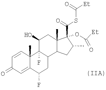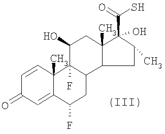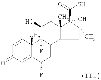 или его соли с соединением формулы LCH2F, где L представляет собой уходящую группу, возможно, в присутствии катализатора межфазного переноса, не смешивающегося с водой несольватирующего органического жидкого растворителя и воды; (б) возможно повышают чистоту пропионата флутиказона в органическом слое, осуществляя одну или более чем одну стадию промывки водой; (в) отделяют органический слой от водного слоя и возможно концентрируют пропионат флутиказона в органическом слое; (г) смешивают раствор пропионата флутиказона в не смешивающемся с водой несольватирующем органическом жидком растворителе, присутствующем в органическом слое, с несольватирующим органическим жидким антирастворителем, тем самым вызывая кристаллизацию пропионата флутиказона из раствора в виде кристаллической полиморфной Формы 1. В соответствии со способами, известными из уровня техники, например, описанными в G.H.Phillips et al (1994), J. Med. Chem. 37, 3717-3729 и патенте США 4335121 (Glaxo Group Limited), соединения формулы (II) могут быть получены взаимодействием соединения формулы (III)