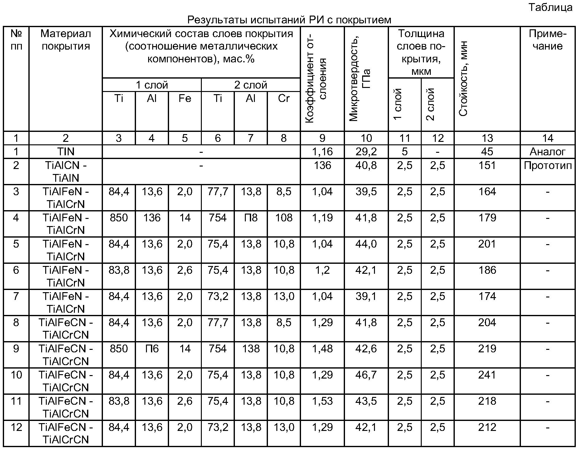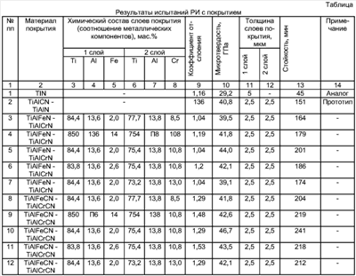 Способ получения многослойного покрытия для режущего инструмента, включающий вакуумно-плазменное нанесение двухслойного покрытия, отличающийся тем, что нижний слой наносят из нитрида или карбонитрида соединения титана, алюминия и железа при их соотношении, мас.%: титан 83,7-85,2, алюминий 13,0-14,2, железо 1,8-2,1, и верхний слой – из нитрида или карбонитрида соединения титана, алюминия и хрома при их соотношении, мас.%: титан 74,1-76,8, алюминий 13,0-14,5, хром 10,2-11,4, при этом нанесение слоев покрытия осуществляют расположенными горизонтально в одной плоскости тремя катодами, первый из которых изготавливают составным из титана и железа, второй – составным из титана и хрома и располагают противоположно первому, а третий – составным из титана и алюминия и располагают между ними.