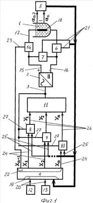 На чертежах показаны гальваническая ванна 1, тиристорный преобразователь 2 с управляющим входом 3, управляющая вычислительная машина 4, измерительные преобразователи 5, один из которых выполнен в виде датчика тока 6, а другой в виде датчика напряжения 7, регуляторы 8-10 параметров процесса, схема 11 выделения минимального управляющего сигнала, задатчики 12-13 параметров процесса и управляемая индуктивность 14, положительная 15 и отрицательная 16 клеммы тиристорного преобразователя 2, токоподвод 17, оксидируемая деталь 18, входной узел 19 управляющей вычислительной машины 4, выходы 20 задатчиков 12-13 параметров процесса, выходы 21 измерительных преобразователей 5-7, выходной узел 22 управляющей вычислительной машины 4, управляющий вход 23 управляемой индуктивности 14, первые 24 и вторые 25 входы, а также первые 26 и вторые 27 выходы регуляторов 8-10 параметров процесса, тиристорного преобразователя 2.