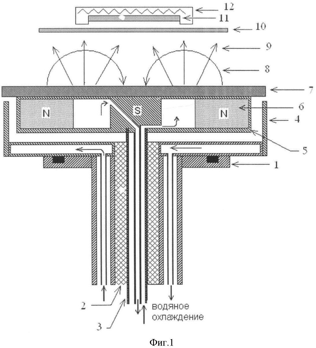 На фиг.1 приведена структурная схема магнетронной распылительной системы для эпитаксии пленок (SiC)1-x(AlN)x с помощью высокочастотного распыления, где 1 – плита установки, 2 – изоляция, 3 – высокочастотный ввод, 4 – заземленный экран, 5 – магнитопровод, 6 – кольцевые ферритовые магниты, 7 – мишень SiC-AIN, 8 – магнитные силовые линии, 9 – поток распыляемого вещества, 10 – заслонка, 11 – подложка SiC, 12 – графитовый нагреватель для подложки.