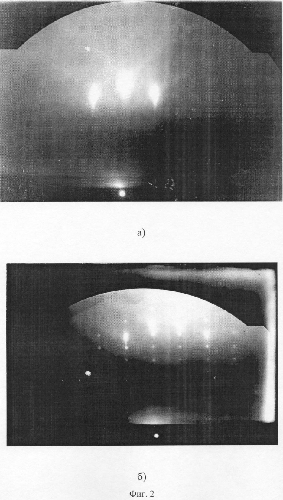 На фиг.2 представлены электронограммы от двух эпитаксиальных пленок (SiC)0,65(AlN)0,35 – а) и (SiC)0,47(AlN)0,53 – б). Точечные рефлексы и Кикучи-линии, видимые на этих электронограммах, свидетельствуют о высоком кристаллическом совершенстве полученных слоев.