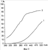На фиг.3 приведены спектры пропускания (SiC)1-x(AlN)x для двух составов: 1 – х=0,5; 2 – х=0,3. Смещение края спектра пропускания с увеличением концентрации х в коротковолновую область объясняется увеличением ширины запрещенной зоны.