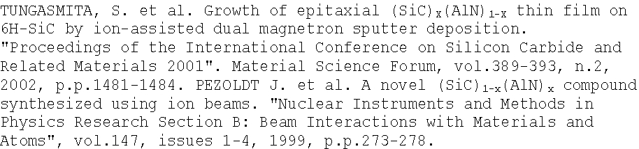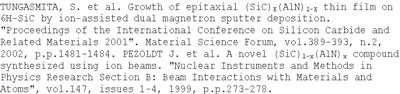 Известно также, что для получения твердых растворов (SiC)1-x(AlN)x применяется метод магнетронного ионно-плазменного распыления из двух источников (Tungasmita S. et al. Growth of epitaxial (SiC)1-x(AlN)x thin films on 6H-SiC by ion-assisted dual magnetron sputter deposition. Proceedings of the international Conference on Silicon Carbide and Related Materials. 2001. Materials Science Forum., vol.389-393, n.2, 2002, p.1481-1484).