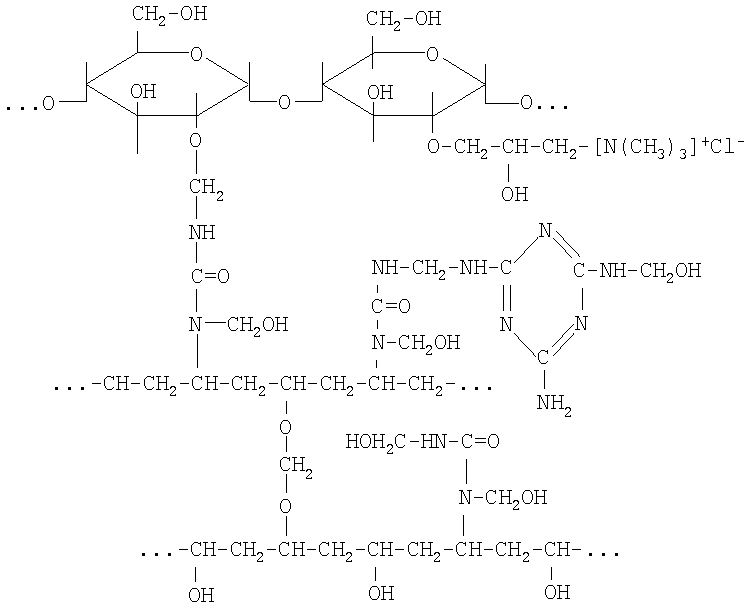 Техническая сущность изобретения заключается в следующем: Схематично структурная формула олигомера может быть представлена в следующем виде: В данной формуле отражены основные структурные единицы карбамидомеламиноформальдегидного олигомера, а также характер химических связей между ними. Характерно наличие большого количества гидроксилов (в т.ч. в составе метилольных групп) и поперечных связей, в частности, их наибольшее количество наблюдается между элементами линейных молекул поливинилового спирта, образованных в результате сшивки формальдегидом при синтезе олигомера. Использование меламина в качестве компонента карбамидоформальдегидного олигомера повышает устойчивость водных растворов последнего, а при обработке данным олигомером бумажно-картонных материалов повышает их гидрофобные свойства. Катионный крахмал как модификатор карбамидоформальдегидного олигомера увеличивает его сродство к целлюлозному материалу за счет наличия большого количества гидроксильных групп и придания катионных свойств (положительного заряда) молекулам олигомера, в то время как поверхность обрабатываемого целлюлозного материала имеет отрицательный заряд. Это облегчает закрепление олигомера на поверхности бумажно-картонного материала. Поливиниловый спирт имеет высокую адгезию к бумажному полотну за счет большого количества активных гидроксильных групп и обеспечивает высокую прочность поверхности бумажного полотна. Изобретение поясняется следующим примером: Изготовляют модифицированный карбамидомеламиноформальдегидный олигомер по следующей технологии: 1. Соотношение компонентов (в % по сухому веществу или в граммах): Формальдегид – 48% (г, в виде 37%-ного формалина – 130 г); Карбамид (основная загрузка, К1) – 22% (г); Карбамид (дополнительная загрузка, К2) – 15% (г); Меламин – 13% (г); Катионный крахмал (например, «Mylbond 143», пр-во компании AMILUM GROUP, Голландия) – 1% (г, в виде 2%-ного водного раствора – 50 г; содержание модификатора – катионного крахмала – минимальное). Поливиниловый спирт – 1% (г, в виде 2%-ного водного раствора – 50 г); (содержание модификатора – поливинилового спирта – минимальное). Технология получения В реакционную колбу емкостью 500 мл, снабженную водяной баней, механической мешалкой, обратным холодильником и термометром, загружают 1 г катионного крахмала, 1 г поливинилового спирта, заливают 98 г воды, включают мешалку и обогрев водяной бани. При достижении температуры смеси в колбе 95°С смесь выдерживают 30 мин при этой температуре. Затем в колбу вводят 13 г меламина, 22 г карбамида (К1) и дают температуре снизиться до 40-50°С, при этом должно произойти полное растворение меламина и карбамида, а рН смеси должно быть 7,5. После этого в колбу вводят 130 г 37%-ного формалина, предварительно нейтрализованного водным раствором NaOH до рН 8,5-9,0. Показатель рН смеси в колбе после этого должен быть равен 8,5±0,2. При необходимости повышают рН, добавляя по каплям 10%-ный водный раствор NaOH. Смесь нагревают до 60-65°С и выдерживают при этих условиях в течение 1,5 ч. Вторую стадию синтеза проводят в слабокислой или нейтральной среде. Для этого рН смеси снижают раствором HCl или NH4Cl до рН 6,5-7,0 и выдерживают при этих условиях в течение 2 ч. После этого доводят рН в колбе до 8,7±0,2, вводят 15 г карбамида (К2) и выдерживают смесь при этих условиях в течение 30 мин. Необходимо сл