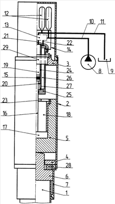 Гидромолот работает следующим образом. Полость 26 между гильзой 24 и обоймой 25 постоянно соединена с напорной линией 9 каналом 22. Таким образом, при включении насоса 8 и системы управления (не показана) в полости 26 и в штоковой полости 20 рабочая жидкость находится под давлением. Поршневая полость 19 может поочередно соединяться через гидрораспределитель 13 с напорной линией 10 или сливной 11. В исходном положении поршневая полость 19 соединена с напорной линией 10. В результате ударная масса 5 находится в нижнем положении под действием собственного веса и избыточной гидравлической силы, действующей на поршень 15 сверху вниз со стороны поршневой полости 19 и равной произведению давления рабочей жидкости на разность площадей поперечного сечения поршневой 19 и штоковой 20 полостей.