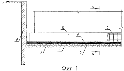 После разработки грунта до проектной отметки, на которой планируется возведение фундаментной плиты, конструкций нулевого цикла и надземной части здания, выполняют работы по выравниванию поверхности грунтового основания 1. Выравнивающий слой 2 может быть выполнен из щебня, песка или любого дренирующего материала или в виде бетонного основания (подготовки). При формовании бетонного основания целесообразно на его поверхность уложить слой гидрофильного порошка, например бентонитовой глины, для связывания излишней влаги в период твердения.