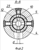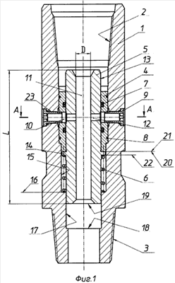 Седло 4 снабжено манжетами 7 и уплотнительными кольцами 8, расположенными в канавках седла 4. На седле 4 выполнены радиальные отверстия 10. Полый плунжер 5 выполнен цилиндрическим длиной «L» с проточным каналом 11 диаметром «D», с радиальными перепускными отверстиями 12 диаметром «d» на поясе скольжения 13 полого плунжера 5. В нижней части пояса скольжения 13 расположен кольцевой бурт 14. В корпусе 1 выполнена расточка 15 с уступом 16 для размещения пружины 6 и расточка 17 с уступом 18 для упора полого плунжера 5 нижним торцом 19 в уступ 18 при его перемещении в крайнее нижнее положение. Кольцевой бурт 14 полого плунжера 5 имеет верхний торец 20, примыкающий к нижнему торцу 21 седла 4, и нижний торец 22, который соприкасается с пружиной 6. В корпусе 1 выполнены радиальные отверстия 23 с резьбой для установки фильтров 9, которые фиксируют седло 4 в корпусе 1 от осевого перемещения. Радиальные отверстия 23 и 10 в корпусе 1 и седле 4, а также радиальные перепускные отверстия 12 в полом плунжере 5 расположены на одном уровне с равным угловым расположением осей в секущей плоскости А-А, что показано на фиг.1 и 2.