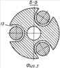 К недостаткам этого калибратора также относится недостаточная прочность из-за выполнения продольных пазов в корпусе сквозными, необходимость включения в конструкцию центральной втулки, которая обеспечивает подачу очистного агента к породоразрушающему инструменту, что также отрицательно влияет на прочностные характеристики колец, взаимодействующих с цапфами шарошек. Кроме того, не исключена возможность заклинивания колец, которые должны свободно проворачиваться от взаимодействия с цапфами, из-за значительных сил трения, возникающих при контакте колец с центральной втулкой.