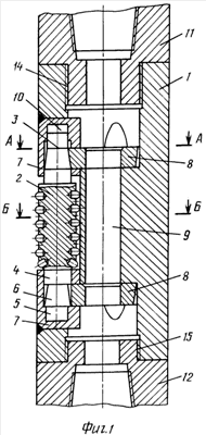 В теле корпуса 1 калибратора выполнены монтажные отверстия 14 и 15 с резьбой для соединения с переходниками 11 и 12 имеющими резьбу с шагом, равным шагу резьбы монтажных отверстий 14 и 15.