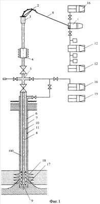 3. Способ по п.1, отличающийся тем, что противодавление в кольцевом и затрубном пространствах создают подачей газообразного агента от соседней скважины, или газопровода, или от азотно-бустерной установки, или от двигателя внутреннего сгорания.
