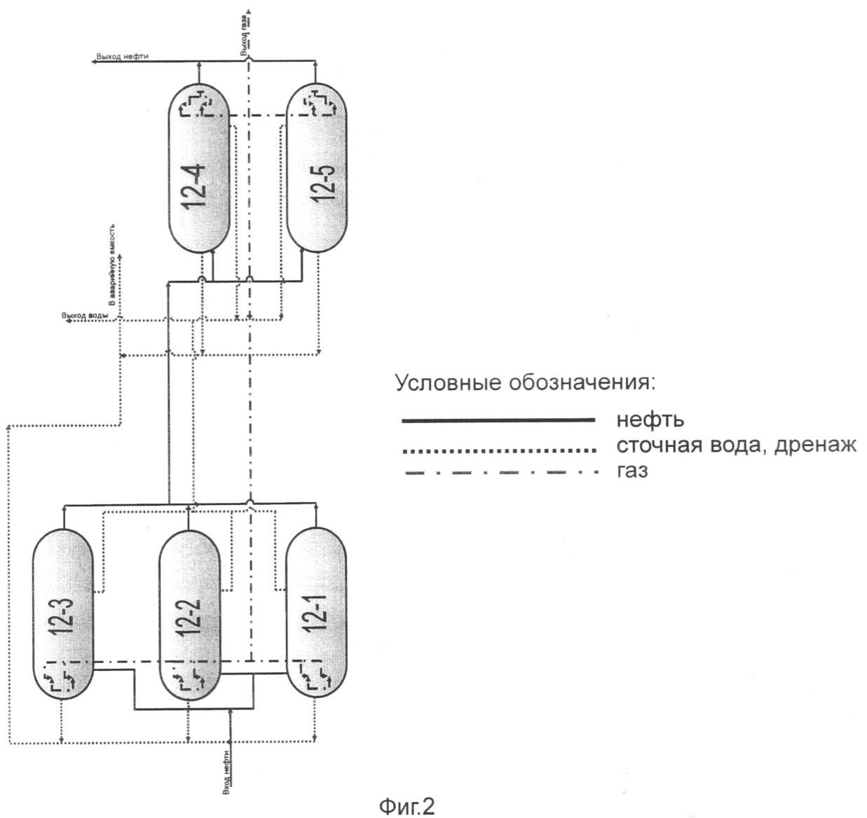 В качестве резервного дегидратора 12 используют 5 дегидраторов, соединенных в 2 секции (фиг.2). В первой секции три дегидратора 12-1, 12-2 и 12-3 соединены трубопроводами параллельно с объединением всех выходов в один трубопровод, во второй секции два дегидратора 12-4 и 12-5 соединены параллельно с объединением выходов в один трубопровод (фиг.2)