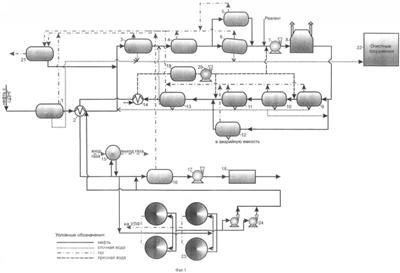 Дренажную воду из аппаратов 1, 3, 6 направляют на очистные сооружения 22 и далее в систему поддержания пластового давления. Дренажную воду из аппаратов 9-13 направляют на вход установки предварительного сброса воды 3.